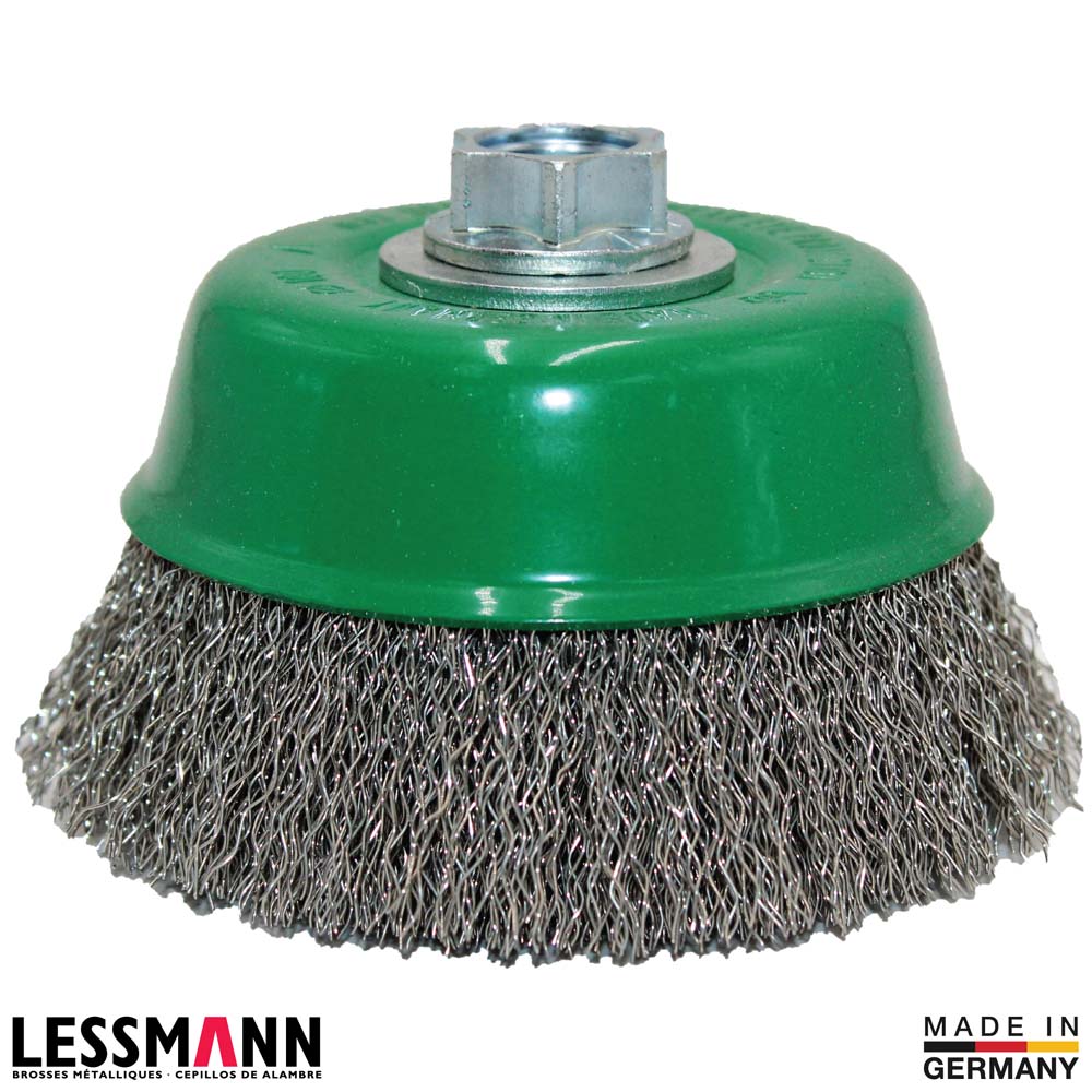 Los cepillos de copa con alambre ondulado son idóneos para el tratamiento de suprficies granes: para eliminar óxidos, pulir, quitar pintura, suciedad o cascarilla.