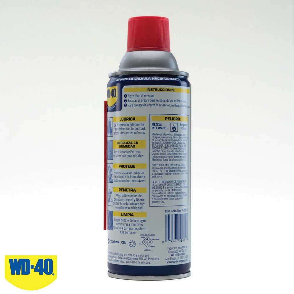WD-40® Producto Multiusos original previene la oxidación del metal, afloja piezas atascadas, desplaza la humedad y lubrica. La válvula de 360° permite aplicar el producto en cualquier posición.