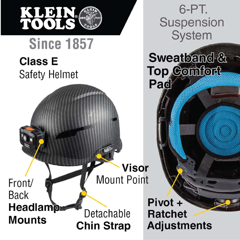 • También disponibles: Linterna frontal recargable, lámpara de seguridad y ventilador (n.º de cat. 56049, 56063, 60155), banda para el sudor, almohadilla superior, correa de barbilla, suspensión (n.º de cat. KHHSWTBND2, KHHTOPPAD2, CLMBRSTRP, CLMBRSPN2).