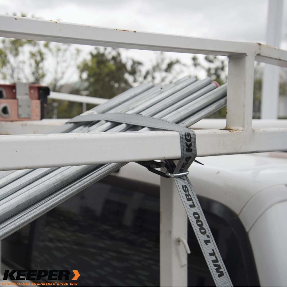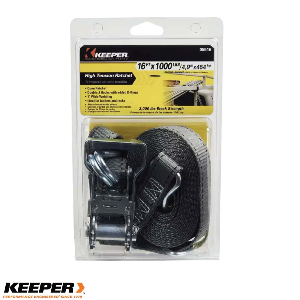 El amarre de trinquete Keeper® de 4,88 m cuenta con una cinta Hi-Test® de 2,54 cm resistente a la abrasión para asegurar la carga y absorber los impactos durante el transporte. Está fabricado con un trinquete de acero duradero, un mango moldeado abierto y ganchos JJ.