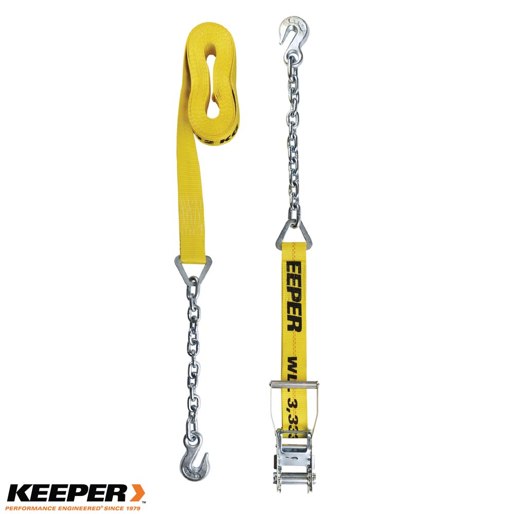 Equipado con extremos de cadena galvanizados y ganchos de agarre, el amarre con trinquete Keeper ofrece una carga útil máxima de 1560 kg y una resistencia a la rotura de 4540 kg. Ideal para cargas grandes y exigentes.