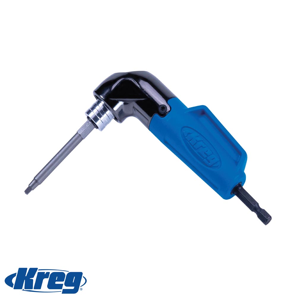 Convierta cualquier taladro en un destornillador de 90° con el destornillador de orificio oculto de 90° de Kreg. Este accesorio de taladro compacto le permite colocar tornillos en lugares a los que normalmente no podría llegar con su taladro.
