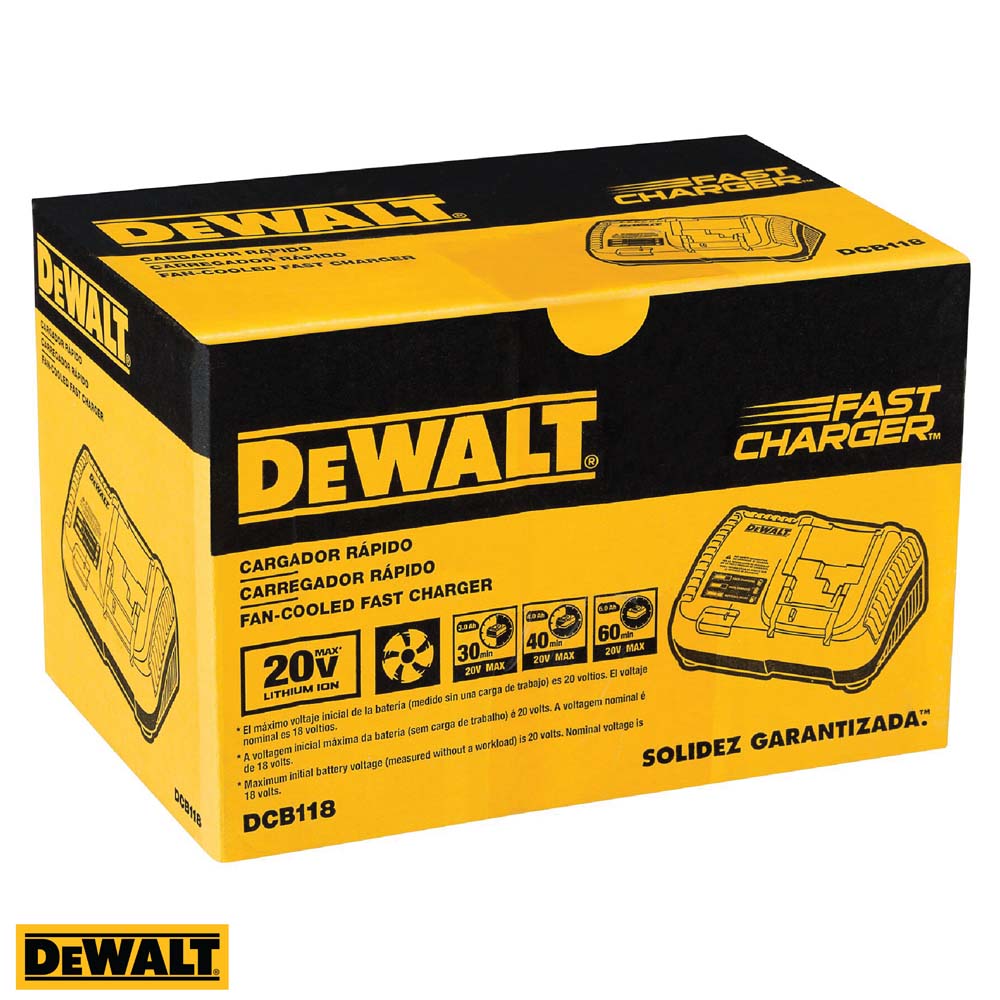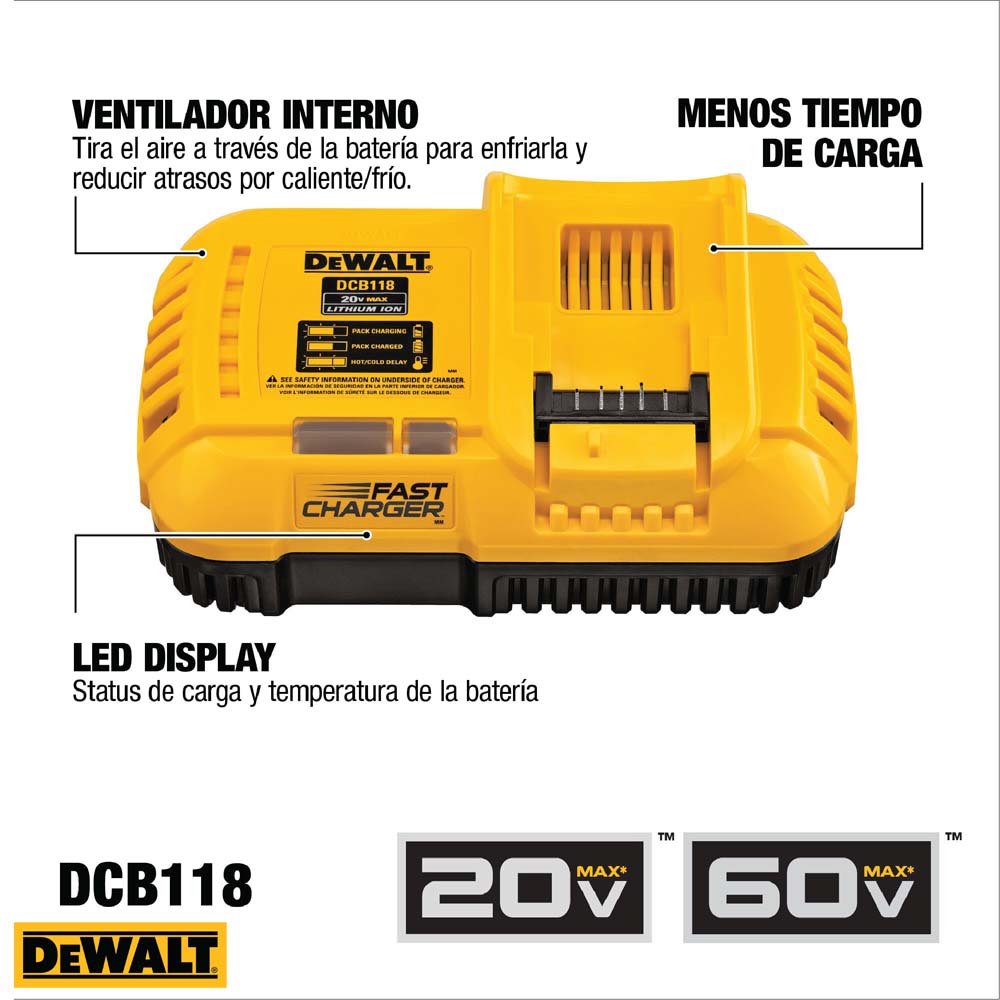 El cargador rápido DEWALT DCB118 es un cargador con ventilador diseñado para reducir el tiempo de carga. Este cargador puede recargar baterías de 20 V MÁX. y FLEXVOLT. El DCB118 puede cargar una batería DCB606 FLEXVOLT en una hora.