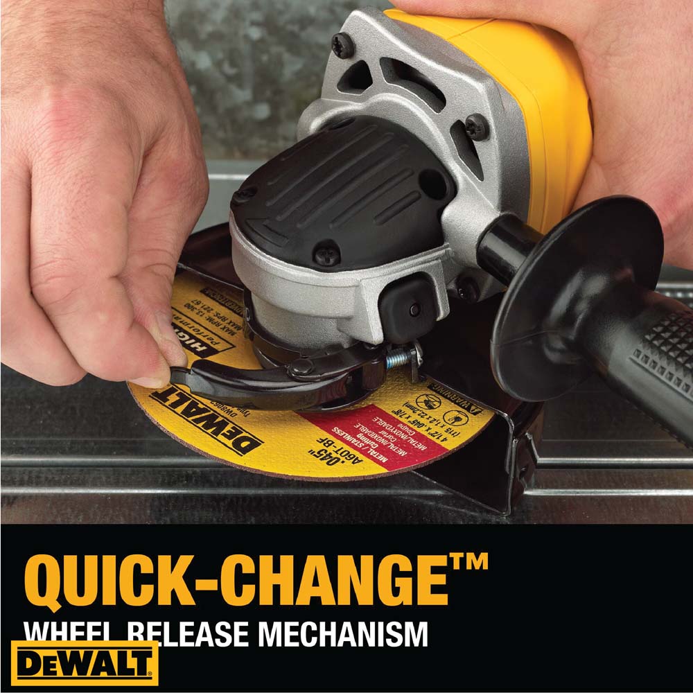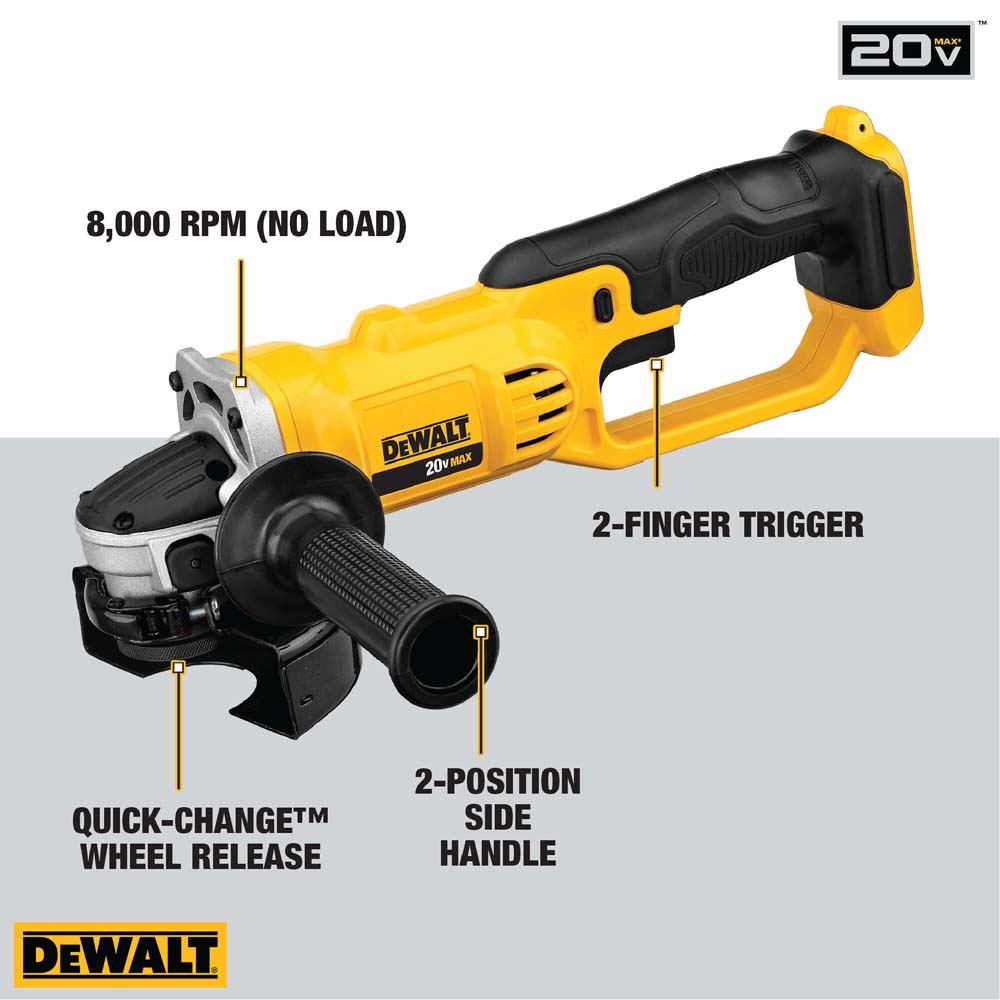Con la extracción de la rueda y los ajustes del protector sin herramientas, esta amoladora de 20 V MAX* de 4,5 pulg./5 pulg. permite ajustes y posicionamiento rápidos. La liberación de rueda Quick-Change™, un práctico interruptor de gatillo con botón de bloqueo, ofrece productividad para cambios rápidos de rueda. Compatible con baterías y cargadores de 20 V MAX*, este producto inalámbrico se puede agregar a su línea existente.