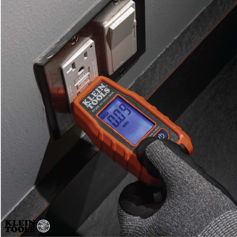 • Probador de receptáculo GFCI que cuenta con una pantalla LCD grande retroiluminada que muestra valores de voltaje y una identificación clara de las condiciones de cableado