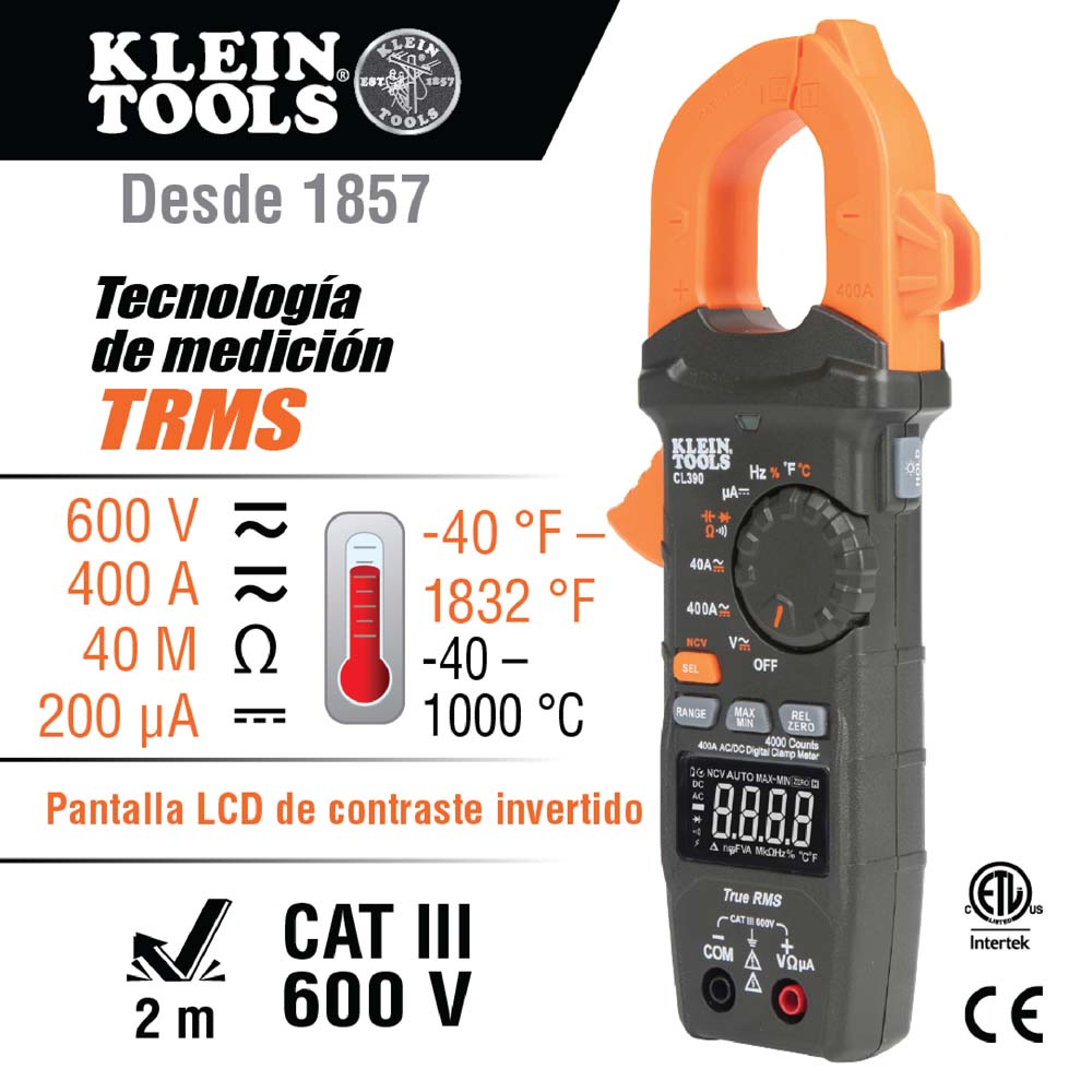 Características especiales: Tecnología de medición de rango automático con media cuadrática real (TRMS) que ofrece mayor precisión; medición de corriente CA/CD; pantalla de alta visibilidad y contraste invertido; NCVT