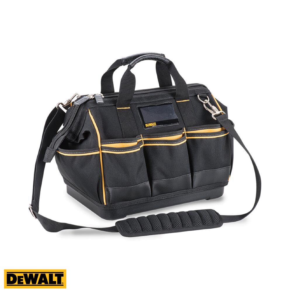 La bolsa de herramientas de 14" cuenta con una base rígida resistente al agua, un cómodo asa de agarre de PVC y múltiples bolsillos internos y externos (9 en total - 6 internos).