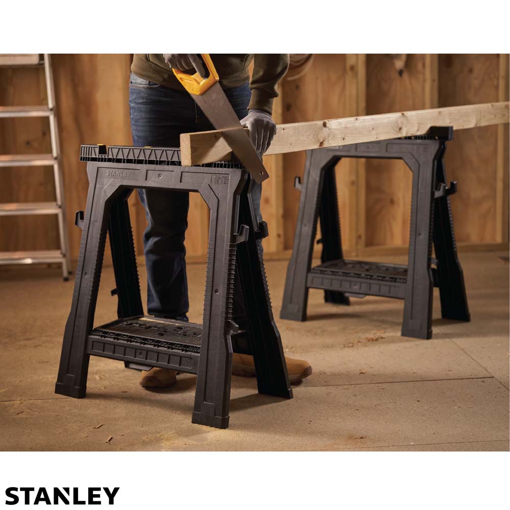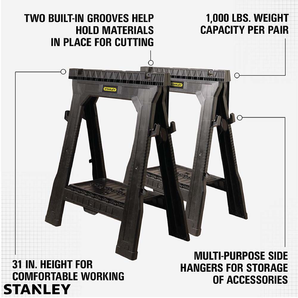 El caballete plegable portátil Stanley asegura la superficie de corte. Estos caballetes son plegables para facilitar su transporte y almacenamiento. Cuando se utilizan en pares, este paquete doble de caballetes livianos y resistentes puede soportar 1000 libras.
