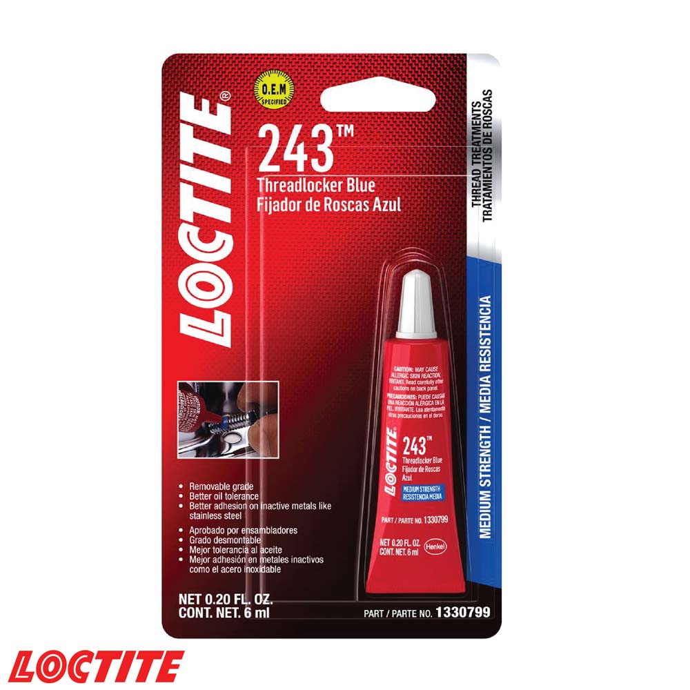 LOCTITE 243 es un adhesivo fijador de roscas azul de resistencia media que sella y fija tuercas y pernos para evitar su aflojamiento a causa de impactos y vibraciones.