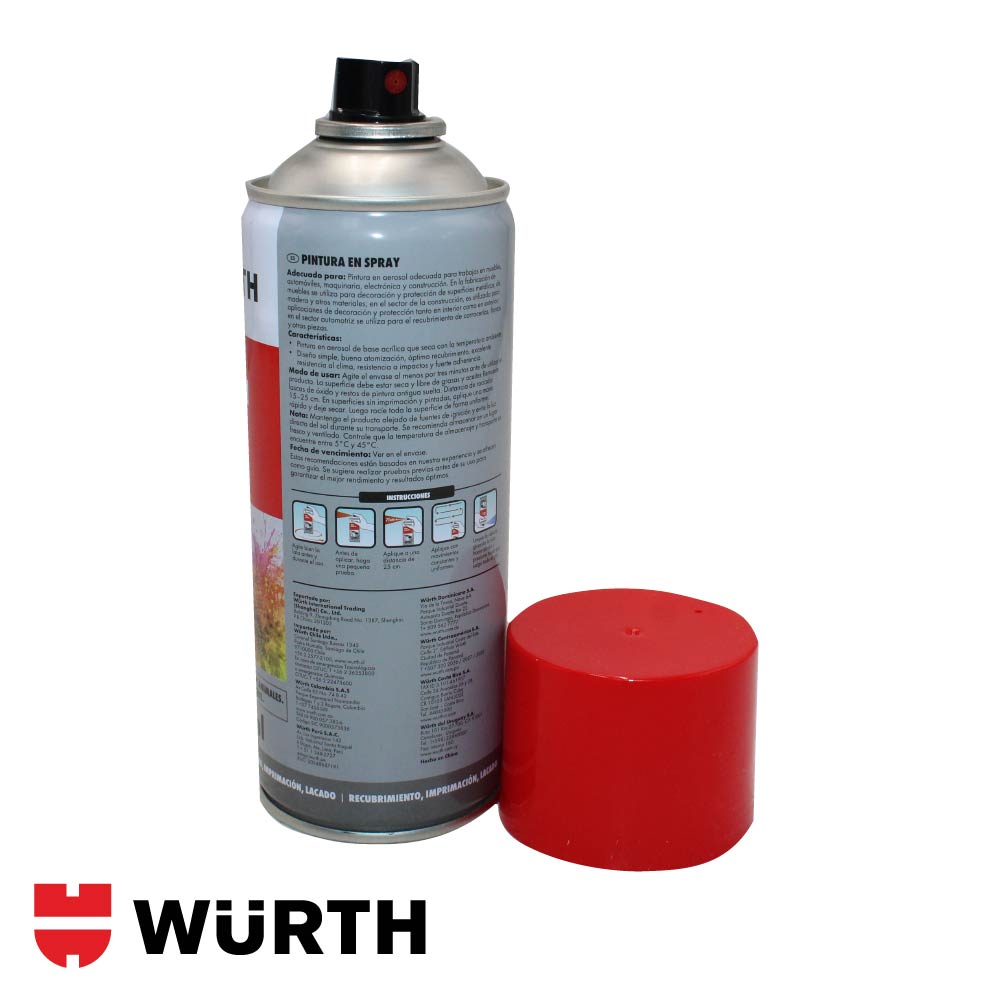 La pintura en spray Würth está formulada con base acrílica y nitroalcano, lo que le confiere un secado rápido y una excelente adherencia sobre diversos materiales. Se presenta en envases de 400 ml (250 g netos) y está disponible en una amplia gama de colores normalizados por código RAL. Su aplicación es sencilla gracias a su buena atomización y cobertura uniforme. Es resistente al agua y apta para trabajos tanto en interiores como exteriores. No es adecuada para aplicaciones que requieran resistencia a altas temperaturas.