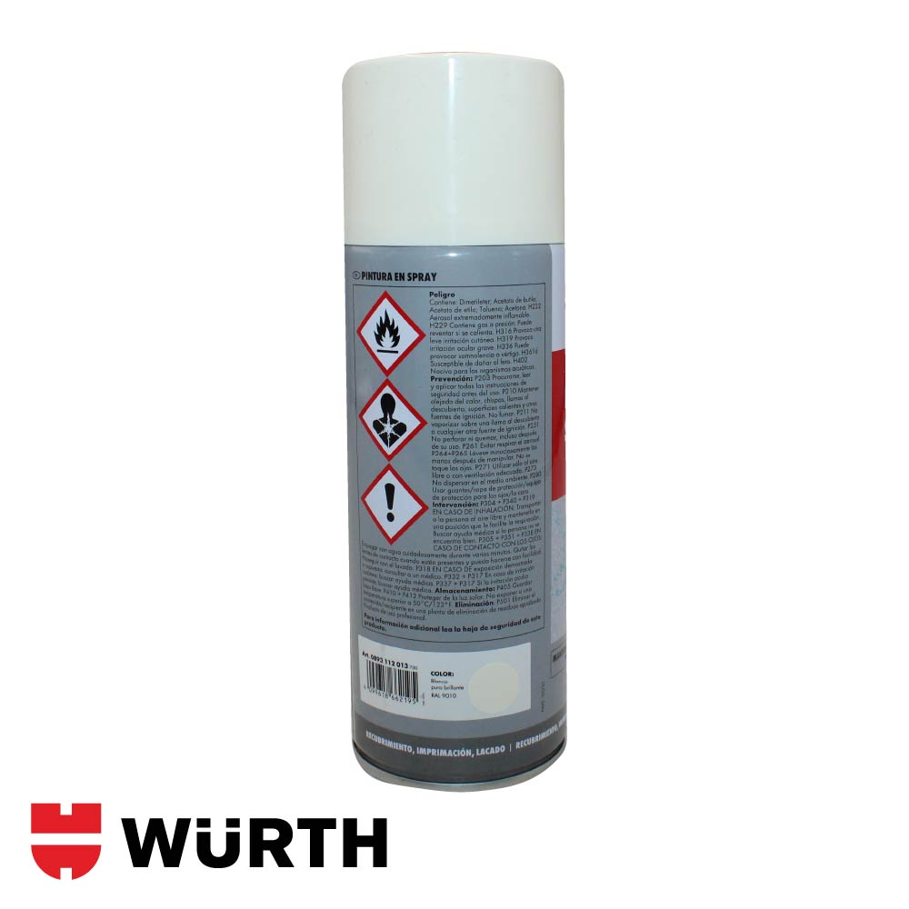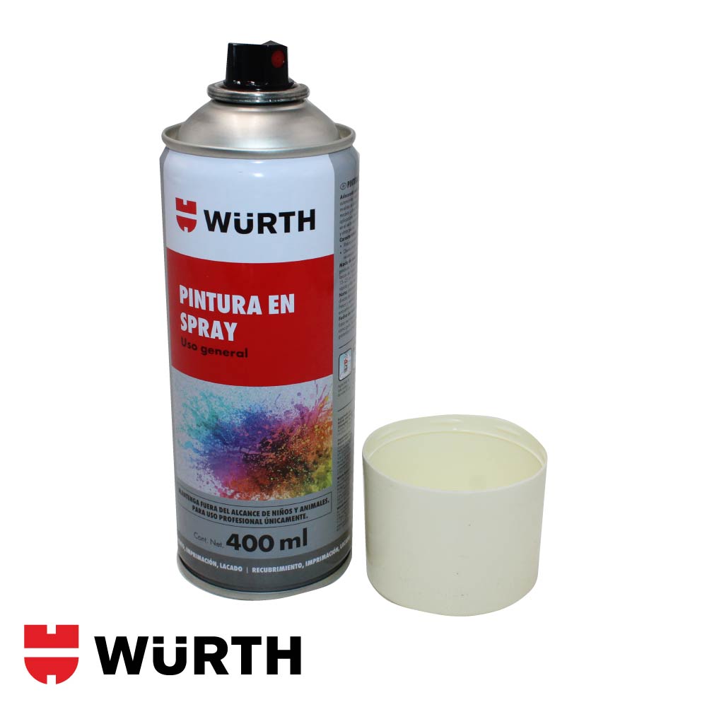 La pintura en spray Würth está formulada con base acrílica y nitroalcano, lo que le confiere un secado rápido y una excelente adherencia sobre diversos materiales. Se presenta en envases de 400 ml (250 g netos) y está disponible en una amplia gama de colores normalizados por código RAL. Su aplicación es sencilla gracias a su buena atomización y cobertura uniforme. Es resistente al agua y apta para trabajos tanto en interiores como exteriores. No es adecuada para aplicaciones que requieran resistencia a altas temperaturas.