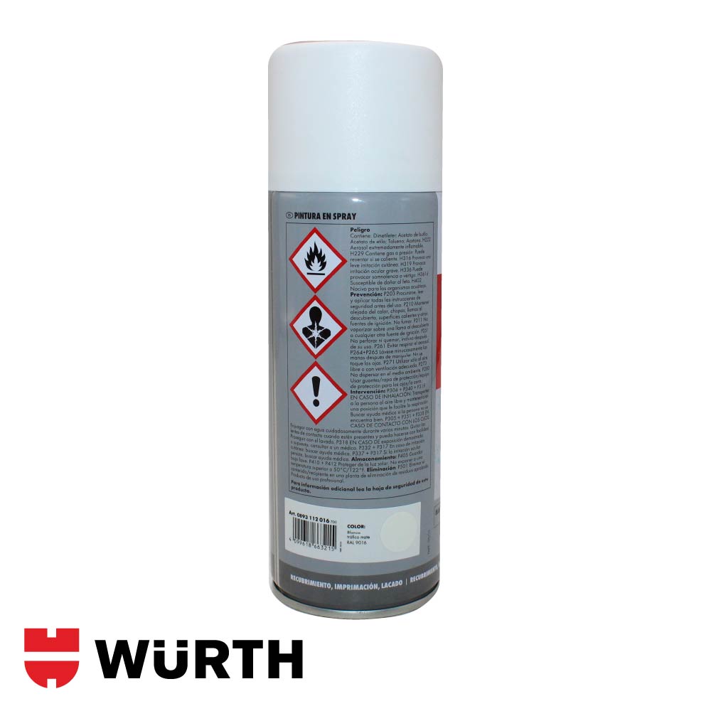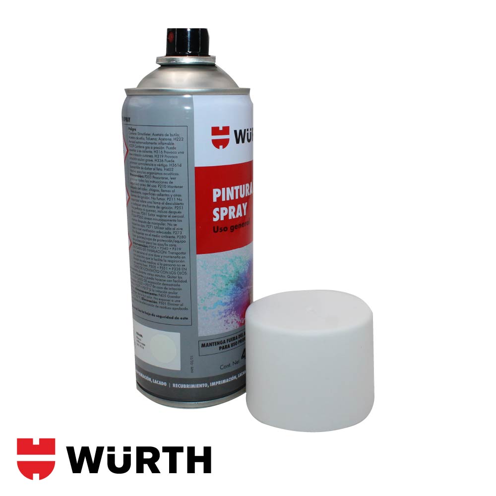 La pintura en spray Würth está formulada con base acrílica y nitroalcano, lo que le confiere un secado rápido y una excelente adherencia sobre diversos materiales. Se presenta en envases de 400 ml (250 g netos) y está disponible en una amplia gama de colores normalizados por código RAL. Su aplicación es sencilla gracias a su buena atomización y cobertura uniforme. Es resistente al agua y apta para trabajos tanto en interiores como exteriores. No es adecuada para aplicaciones que requieran resistencia a altas temperaturas.