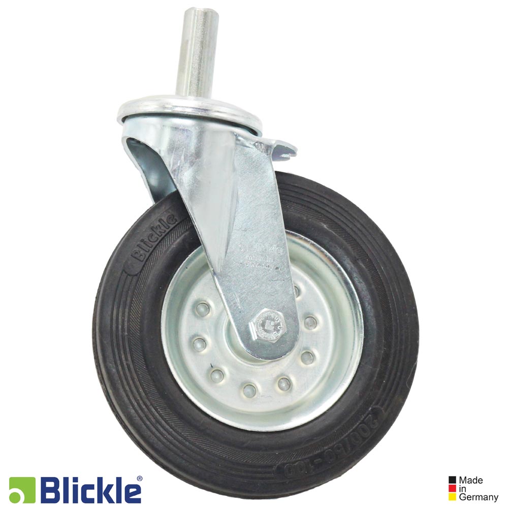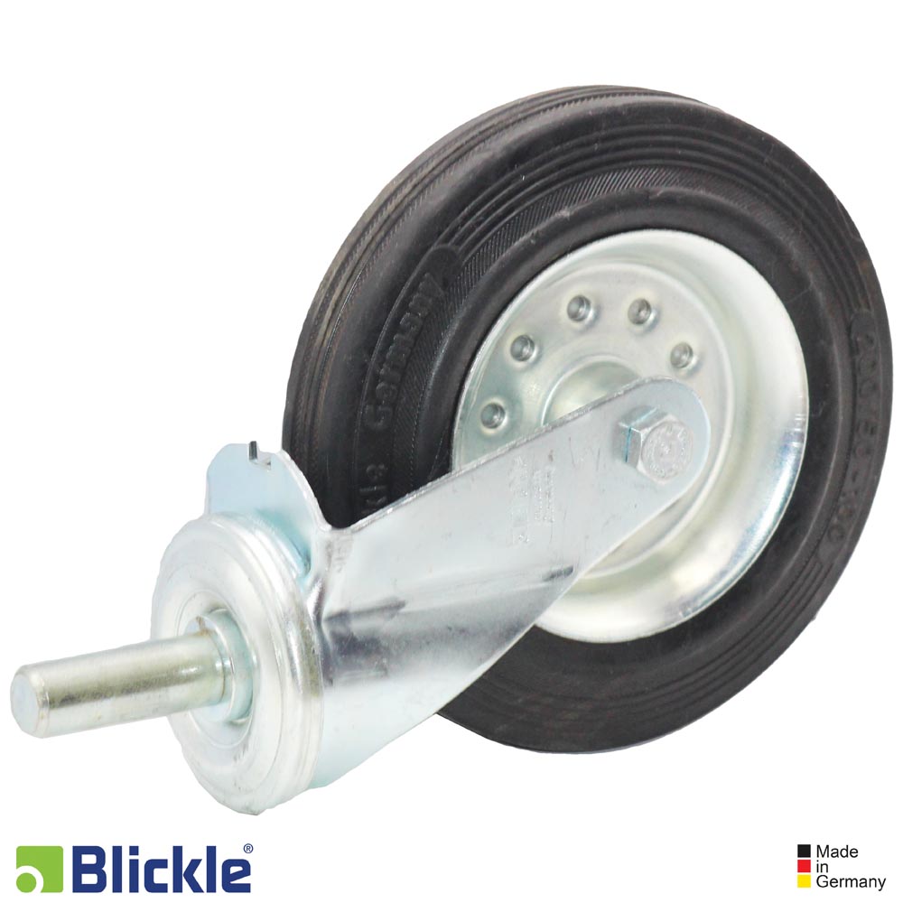 Soporte: estampado de chapa de acero, con doble carril de bolas en la cabeza giratoria, protección de bolas mediante forma especial de la placa base y arandela esférica. El carril de bolas está remachado dinámicamente según un procedimiento especial de Blickle. Este proceso resulta en un juego mínimo de la cabeza giratoria, una marcha suave y una alta durabilidad debido al endurecimiento en frío del carril de bolas. La espiga introducible de acero está atornillada con el vástago central y en consecuencia asegurada o están uniformemente elaborados. Eje de rueda atornillado. Zincado, pasivado color azul, libre de Cr6.