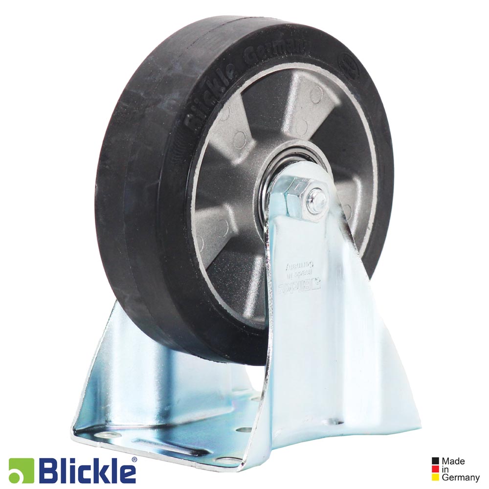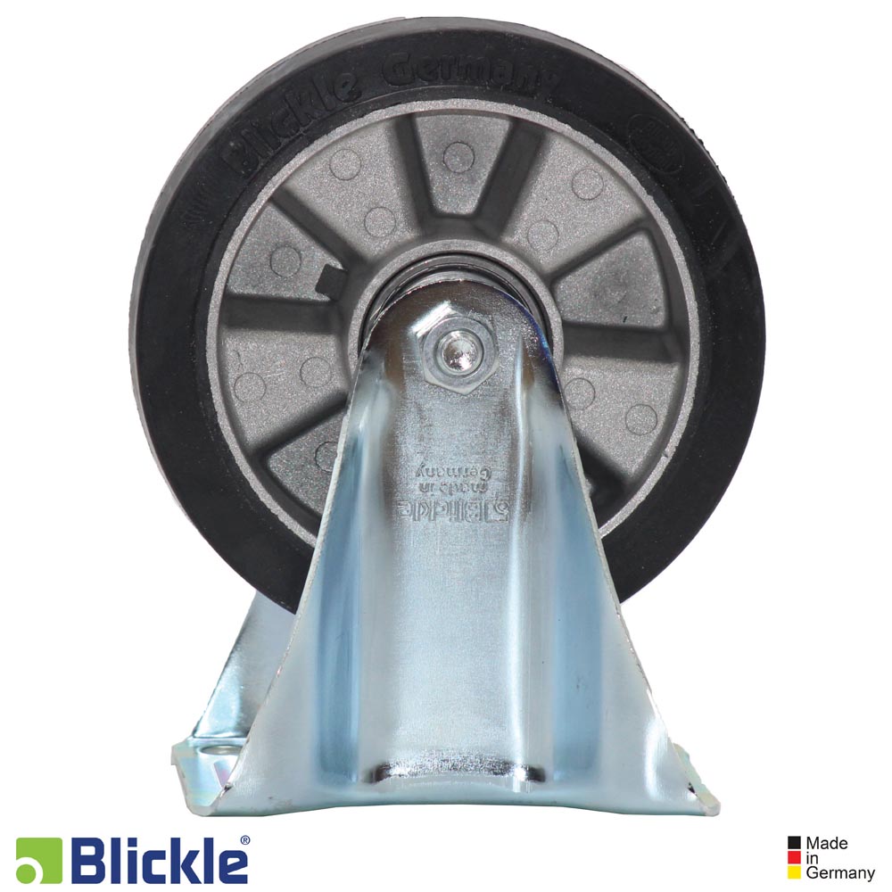 Rodo fijo de chapa de acero, versión mediana, con platina atornillable Rueda de goma maciza elástica para carga pesada “Blickle EasyRoll", con núcleo de aluminio