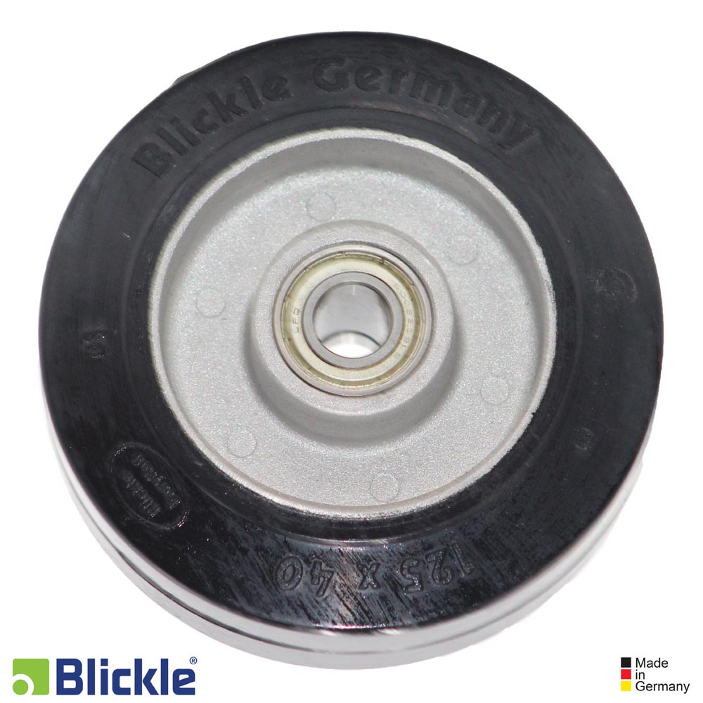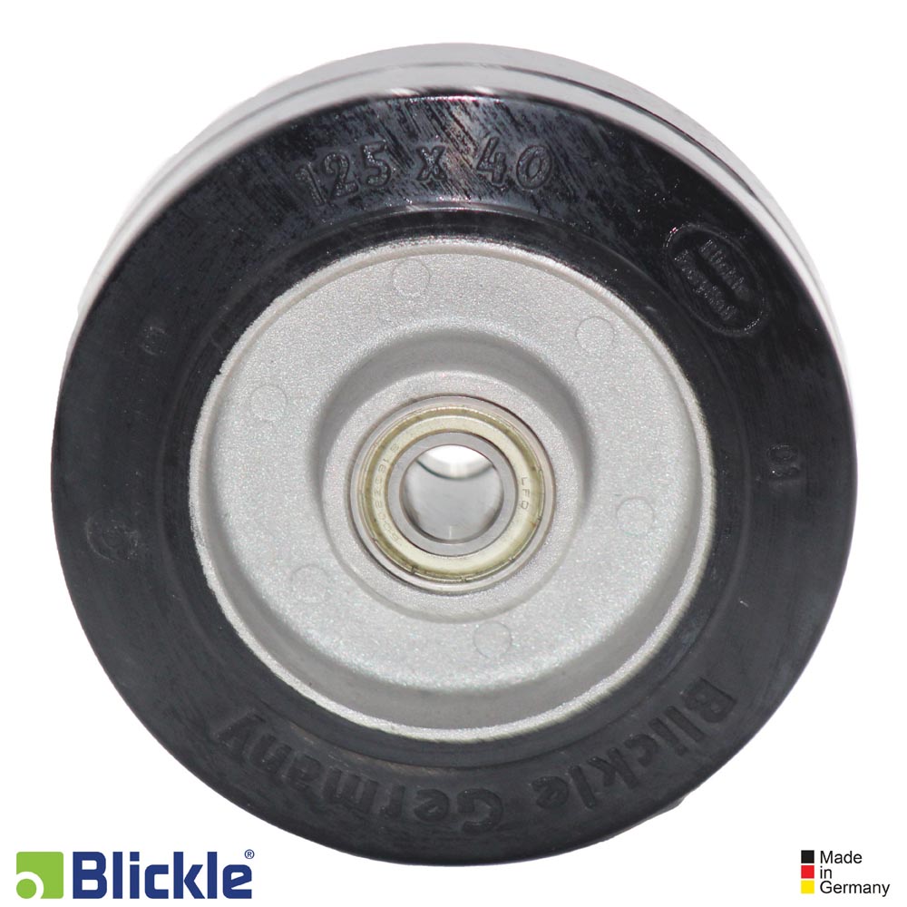 Ruedas: de goma maciza elástica de alta calidad con propiedad de fácil desplazamiento “Blickle EasyRoll", muy alta comodidad de marcha, marcha silenciosa, resistencia a la rodadura baja, muy respetuosa con el suelo, vulcanizada sobre el núcleo.