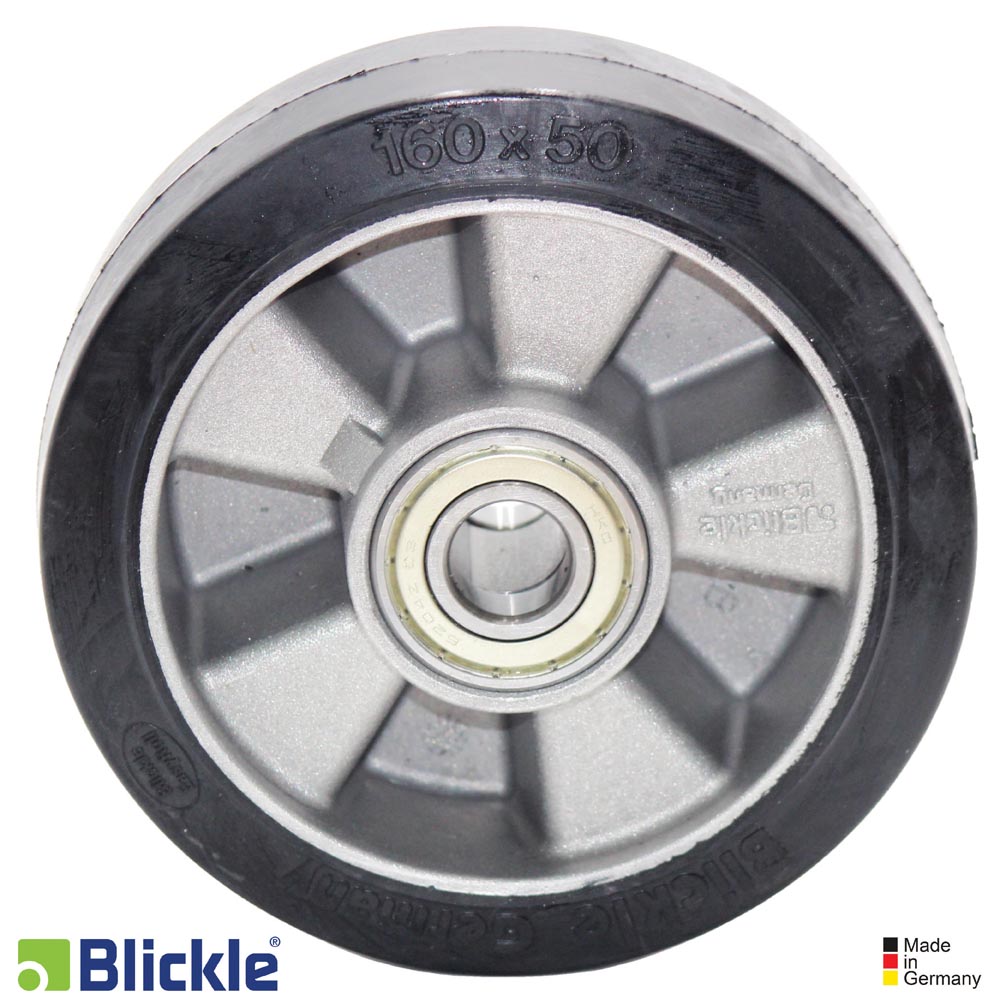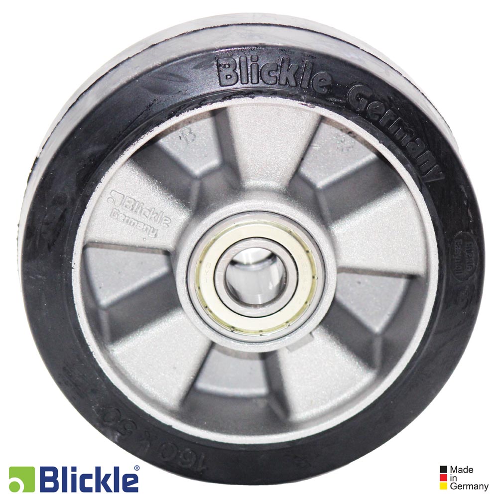 Ruedas: de goma maciza elástica de alta calidad con propiedad de fácil desplazamiento “Blickle EasyRoll", muy alta comodidad de marcha, marcha silenciosa, resistencia a la rodadura baja, muy respetuosa con el suelo, vulcanizada sobre el núcleo.