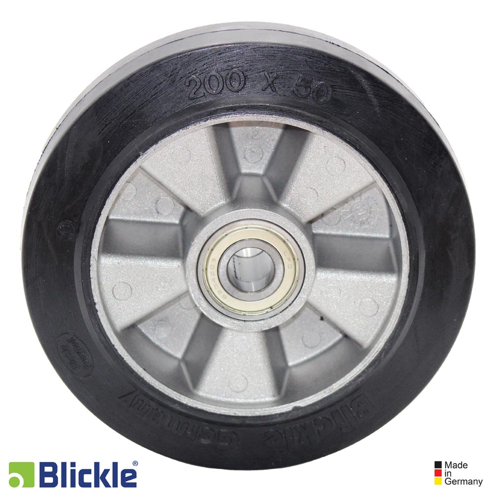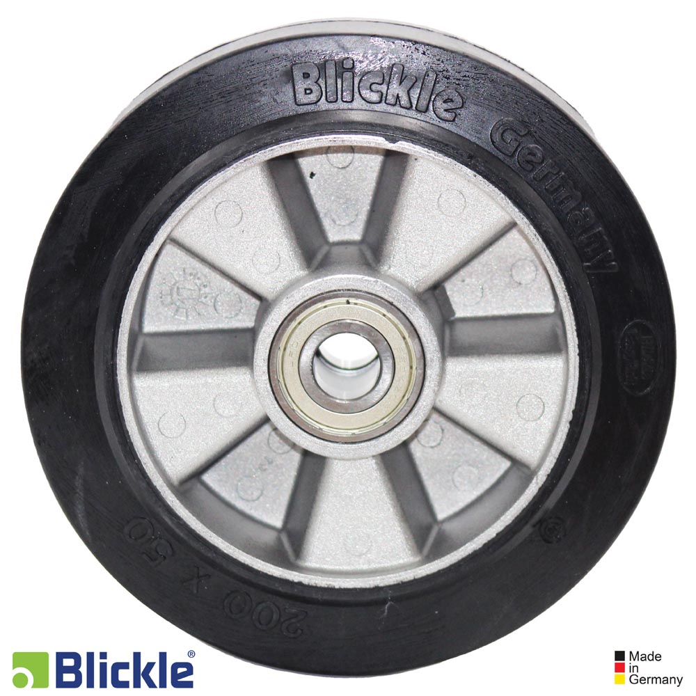 Ruedas: de goma maciza elástica de alta calidad con propiedad de fácil desplazamiento “Blickle EasyRoll", muy alta comodidad de marcha, marcha silenciosa, resistencia a la rodadura baja, muy respetuosa con el suelo, vulcanizada sobre el núcleo.