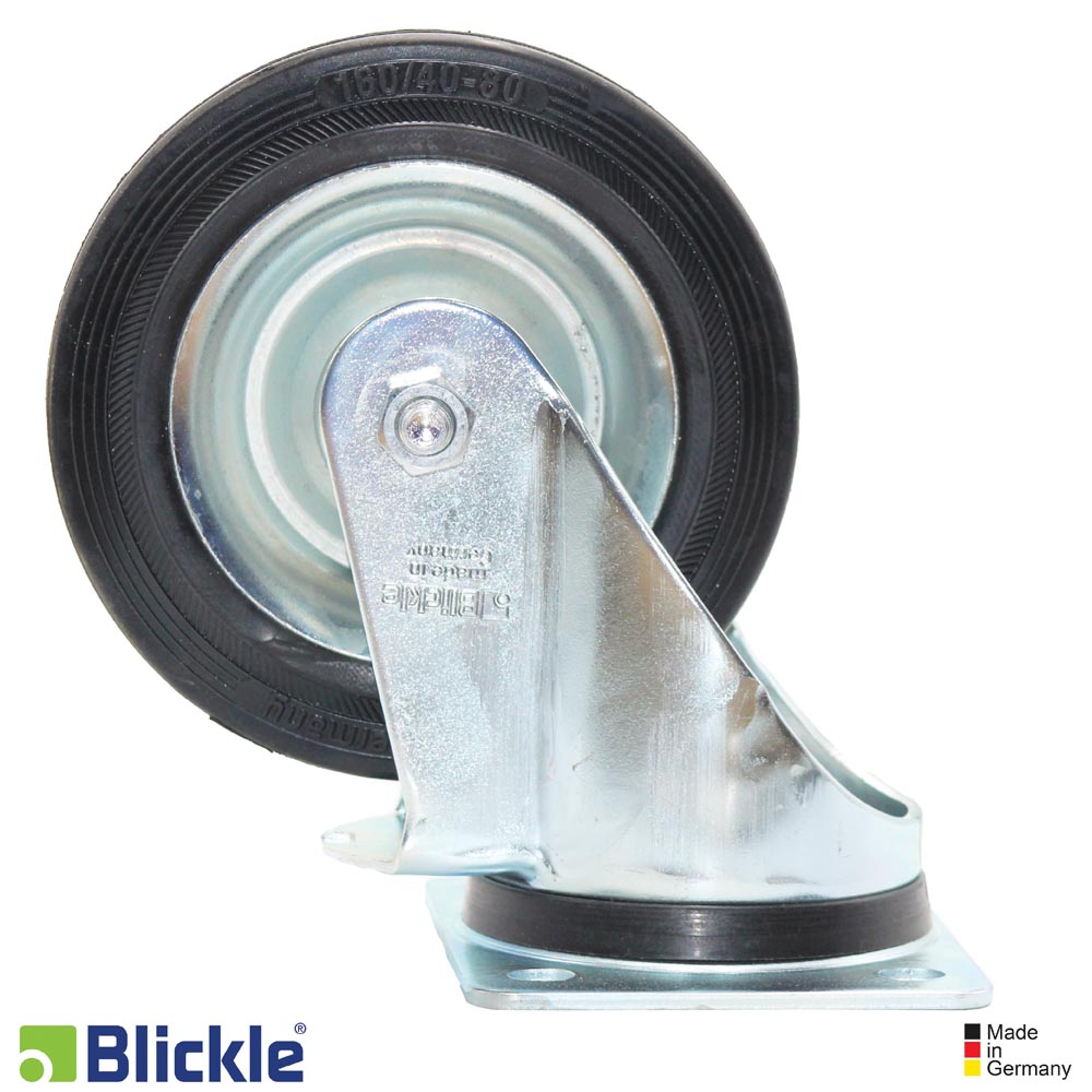 Rodo giratorio con soporte de chapa de acero, versión mediana, con platina atornillable Rueda de goma maciza estándar, con núcleo de chapa de acero, versión reforzada