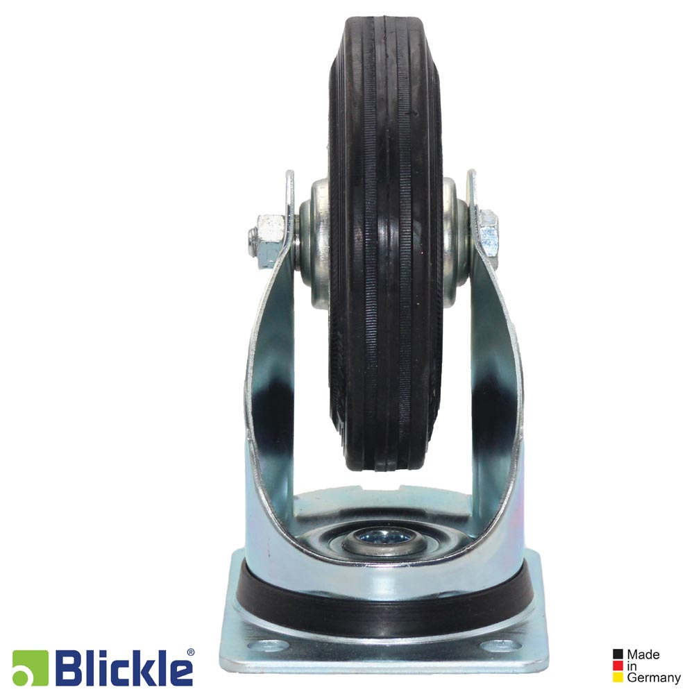 Soporte: estampado de chapa de acero, con doble carril de bolas en la cabeza giratoria, protección de bolas mediante forma especial de la placa base y arandela esférica. El carril de bolas está remachado dinámicamente según un procedimiento especial de Blickle. Este proceso resulta en un juego mínimo de la cabeza giratoria, una marcha suave y una alta durabilidad debido al endurecimiento en frío del carril de bolas. Eje de rueda atornillado. Zincado, pasivado color azul, libre de Cr6.