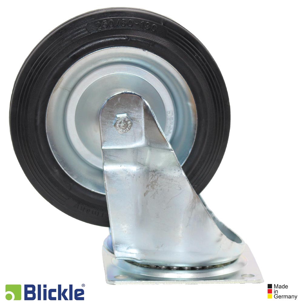 Rodo giratorio con soporte de chapa de acero, versión mediana, con platina atornillable Rueda de goma maciza estándar, con núcleo de chapa de acero, versión reforzada