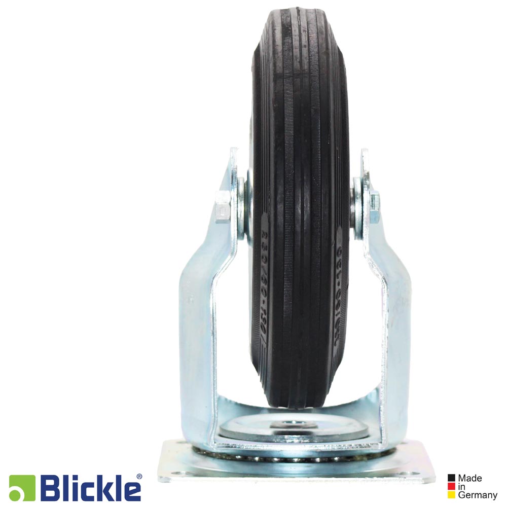 Soporte: estampado de chapa de acero, con doble carril de bolas en la cabeza giratoria, protección de bolas mediante forma especial de la placa base y arandela esférica. El carril de bolas está remachado dinámicamente según un procedimiento especial de Blickle. Este proceso resulta en un juego mínimo de la cabeza giratoria, una marcha suave y una alta durabilidad debido al endurecimiento en frío del carril de bolas. Eje de rueda atornillado. Zincado, pasivado color azul, libre de Cr6.
