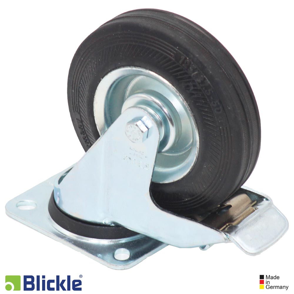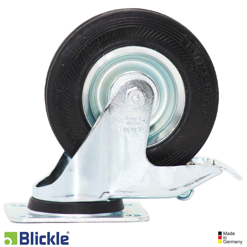 Rodo giratorio con soporte de chapa de acero, versión mediana, con platina atornillable y freno "stop-fix" Rueda de goma maciza estándar, con núcleo de chapa de acero, versión reforzada