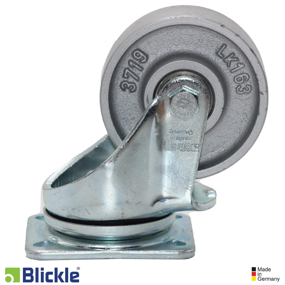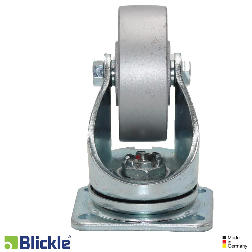 Soporte serie LH/BH: chapa de acero gruesa, zincada, pasivada color azul, libre de Cr6. Horquilla y platina pesada. Doble carril de bolas en la cabeza giratoria. Vástago central muy estable, atornillado y fijado. Especialmente resistente frente a choques y golpes gracias a cuatro cojinetes endurecidos con forma especial.