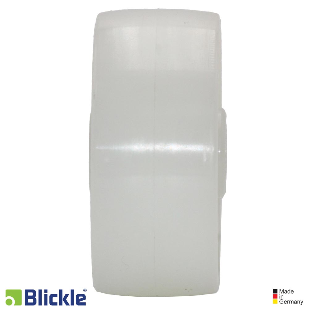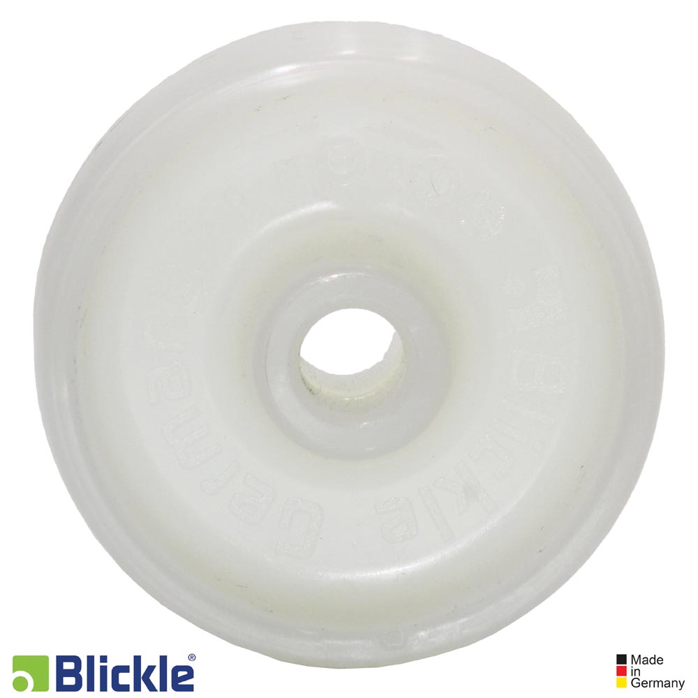 Rueda PO: poliamida 6 de alta calidad, resistente a la rotura, dureza 70 Shore D. Muy baja resistencia a la rodadura y al giro. Fácil deslizamiento sobre los suelos lisos. Muy resistente a la abrasión. Color blanco natural.