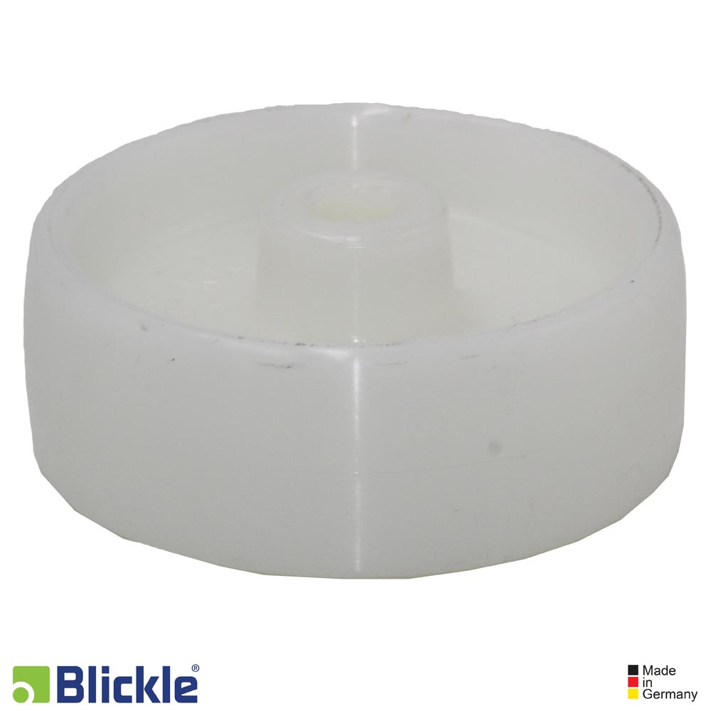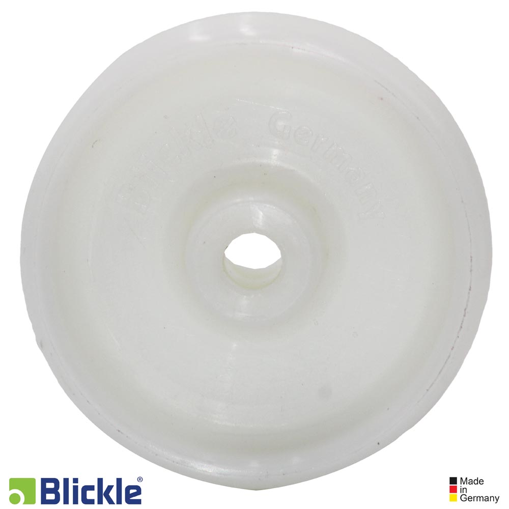 Rueda PO: poliamida 6 de alta calidad, resistente a la rotura, dureza 70 Shore D. Muy baja resistencia a la rodadura y al giro. Fácil deslizamiento sobre los suelos lisos. Muy resistente a la abrasión. Color blanco natural.