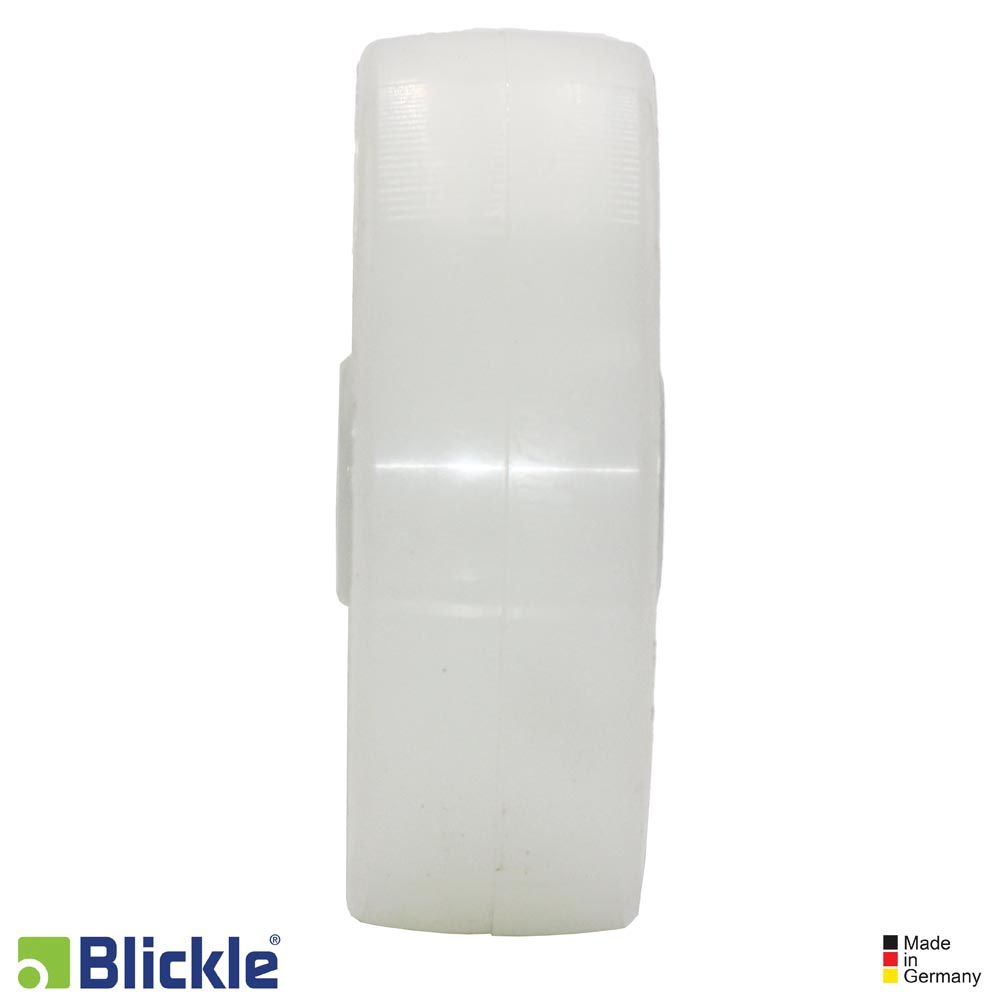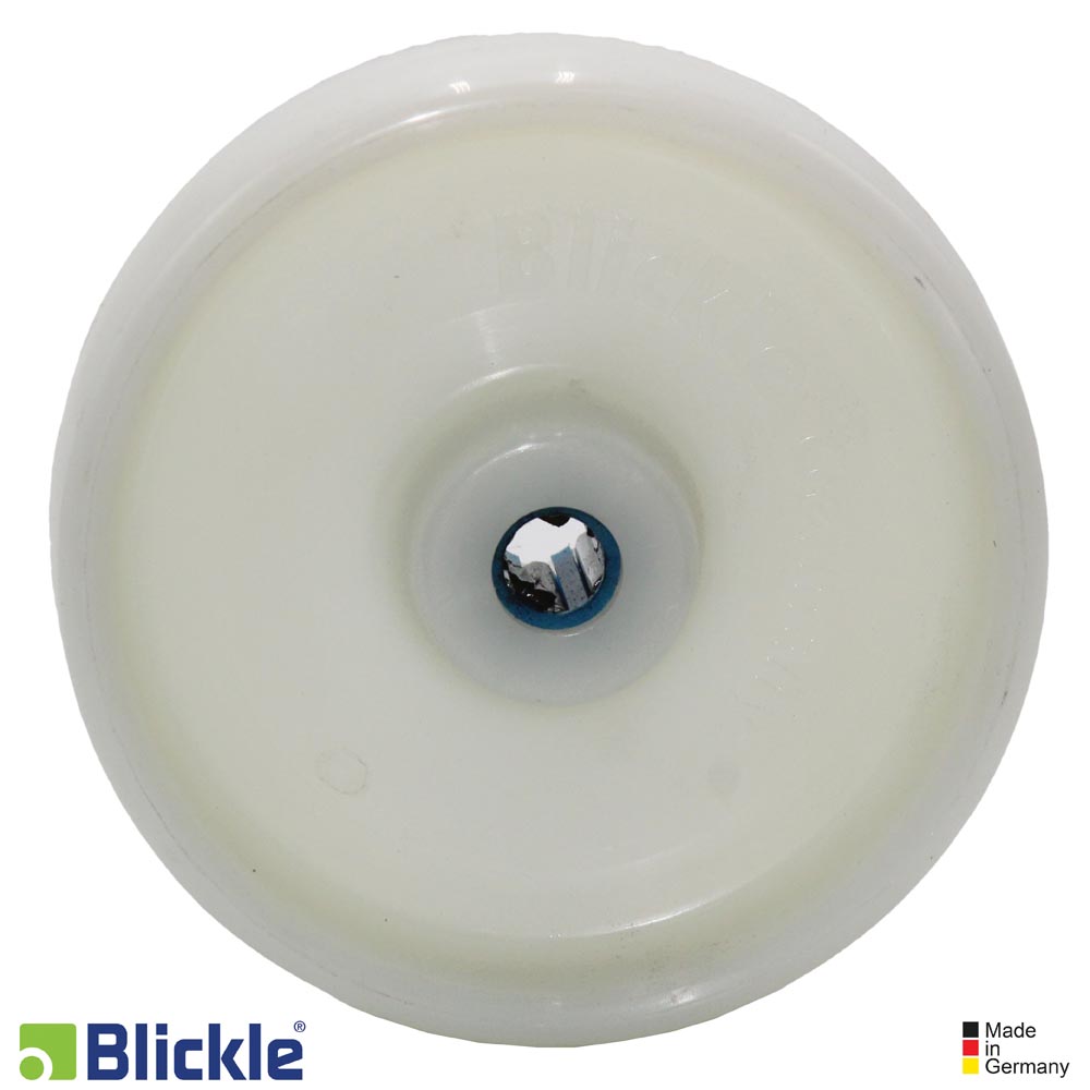 Rueda PO: poliamida 6 de alta calidad, resistente a la rotura, dureza 70 Shore D. Muy baja resistencia a la rodadura y al giro. Fácil deslizamiento sobre los suelos lisos. Muy resistente a la abrasión. Color blanco natural.