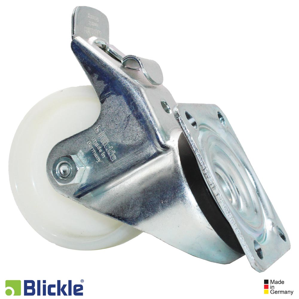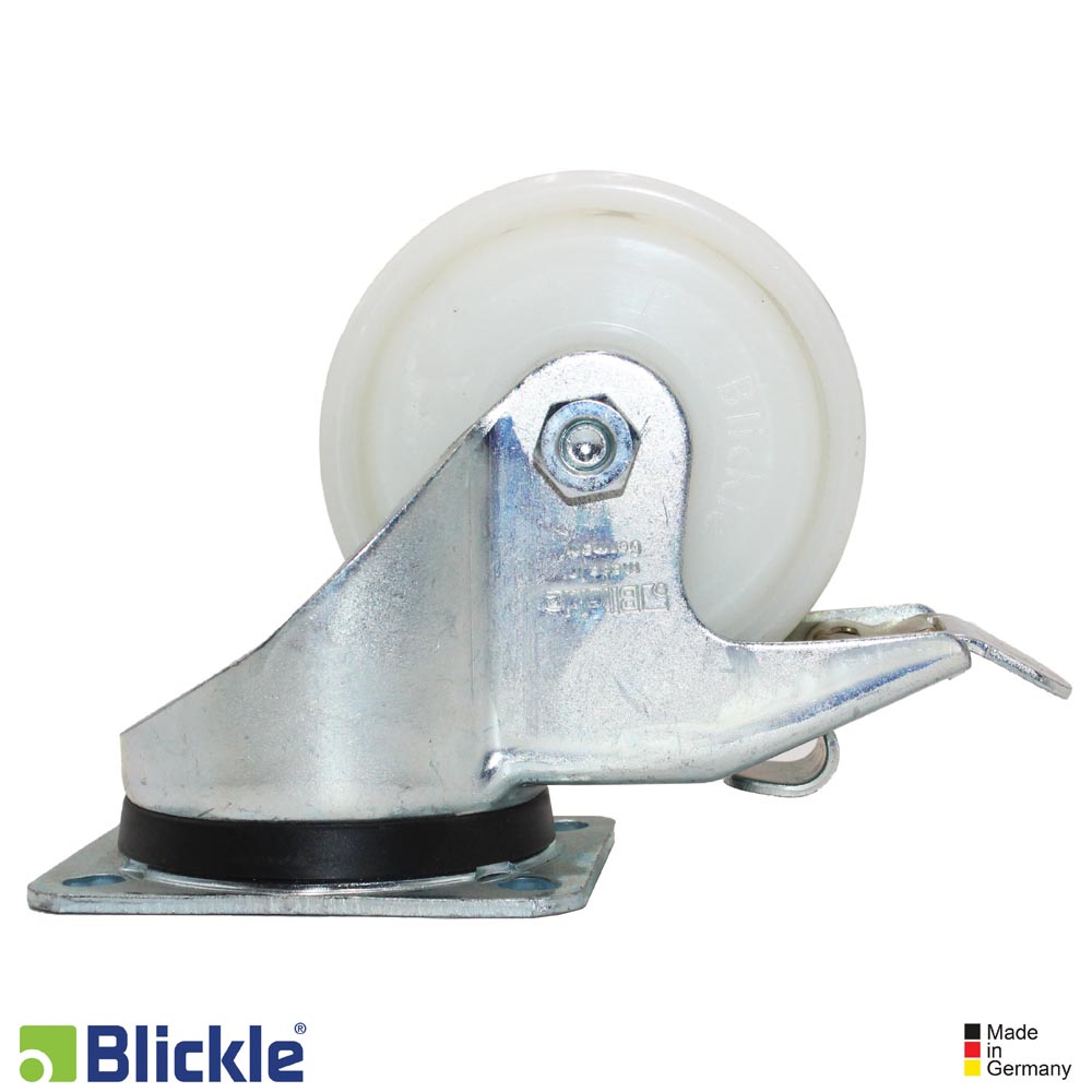 - Soporte: estampado de chapa de acero gruesa, con doble carril de bolas en cabeza giratoria, con cabeza giratoria sellada. El carril de bolas está remachado dinámicamente según un procedimiento especial de Blickle. Este proceso resulta en un juego mínimo de la cabeza giratoria, una marcha suave y una alta durabilidad debido al endurecimiento en frío del carril de bolas. Eje de rueda atornillado. Zincado, pasivado color azul, libre de Cr6.