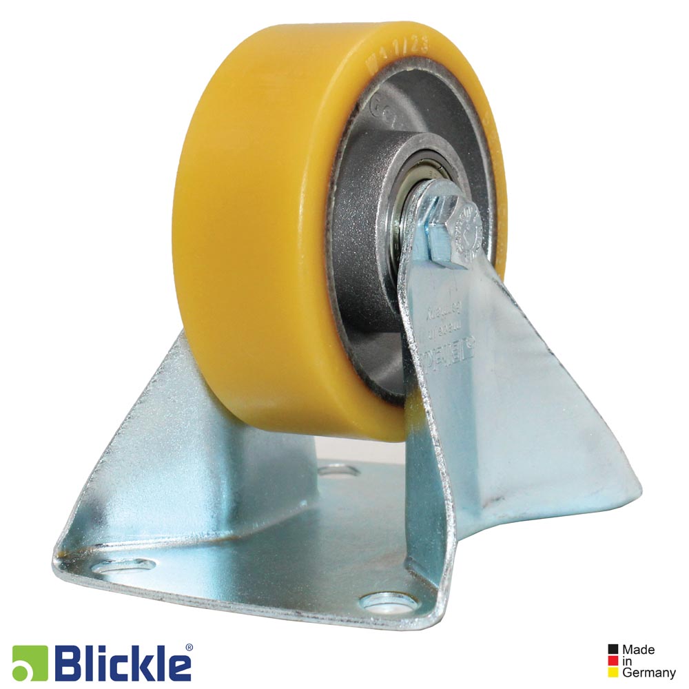 Soporte fijo de chapa de acero, versión semipesada, con platina atornillable, rueda para carga pesada, con banda de rodadura de poliuretano Blickle Extrathane®, con núcleo de aluminio