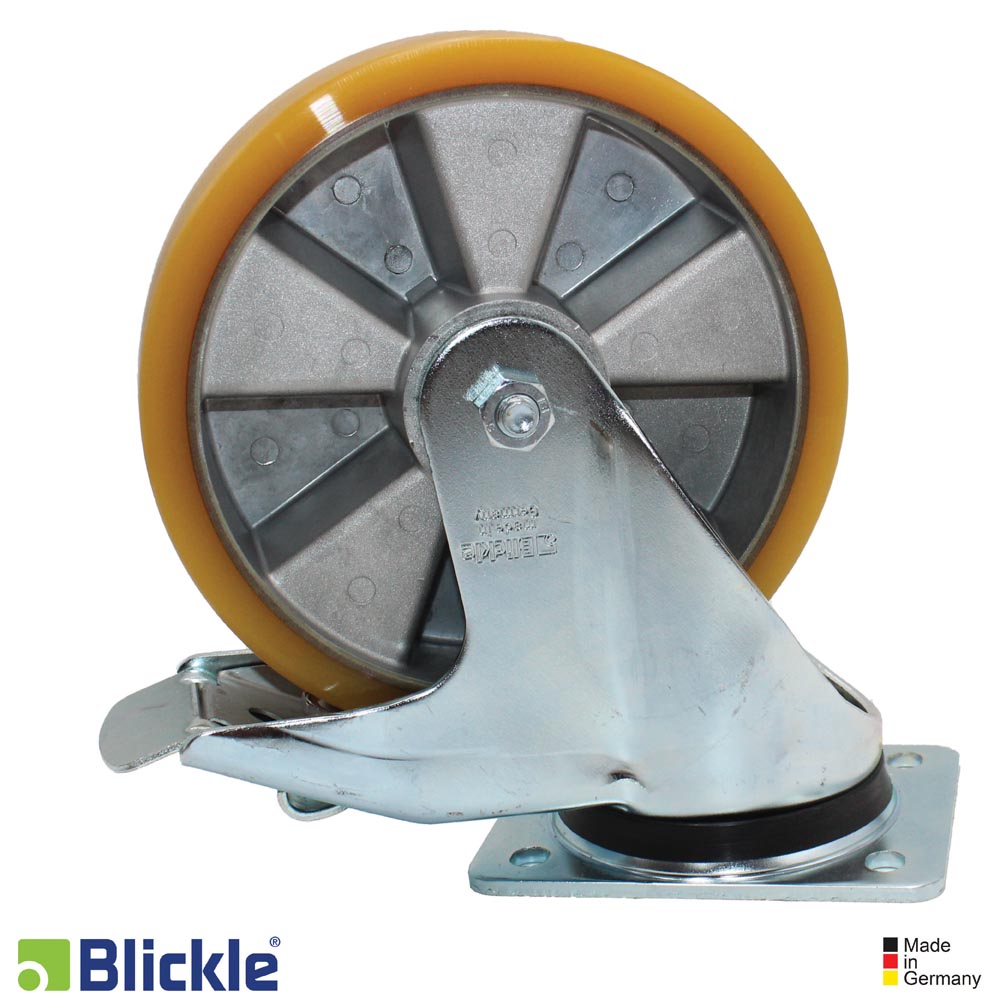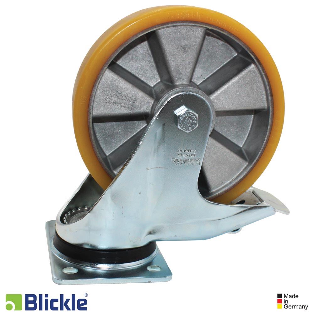 - Ruedas: de elastómero de poliuretano de alta calidad Blickle Extrathane®, inyectado de reacción, marcha silenciosa, resistencia a la rodadura baja, respetuosa con el suelo, muy resistente a la abrasión, alta resistencia a la rasgadura y a las grietas, muy buena unión química con el núcleo.