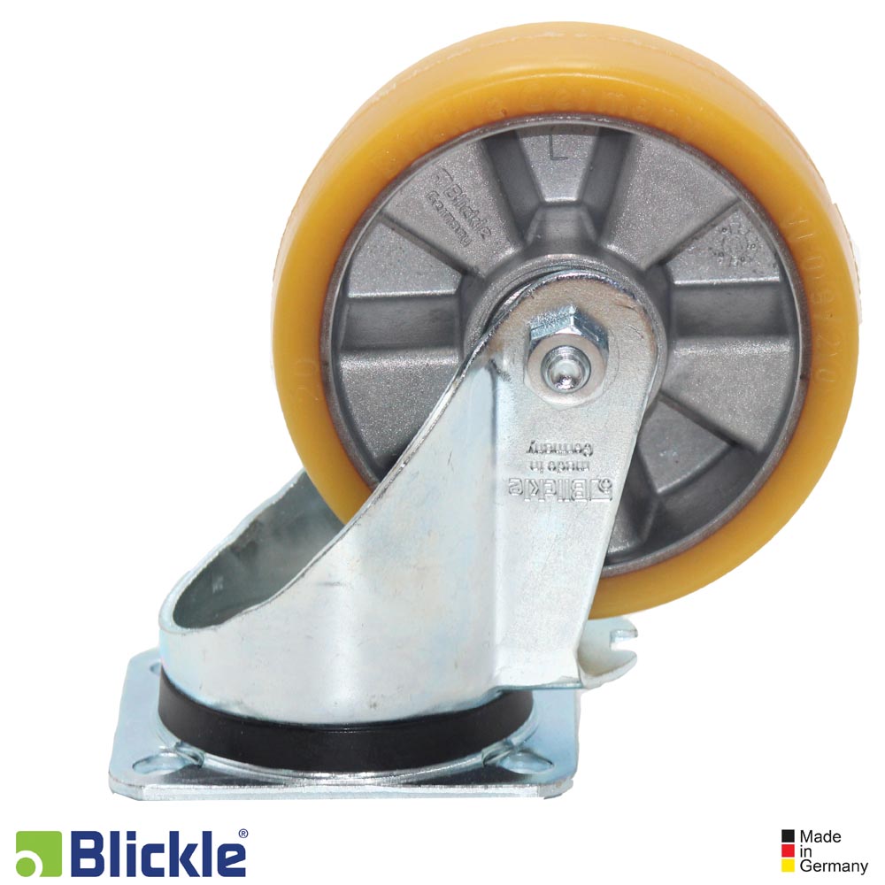 Ruedas: de elastómero de poliuretano de alta calidad Blickle Extrathane®, inyectado de reacción, marcha silenciosa, resistencia a la rodadura baja, respetuosa con el suelo, muy resistente a la abrasión, alta resistencia a la rasgadura y a las grietas, muy buena unión química con el núcleo.