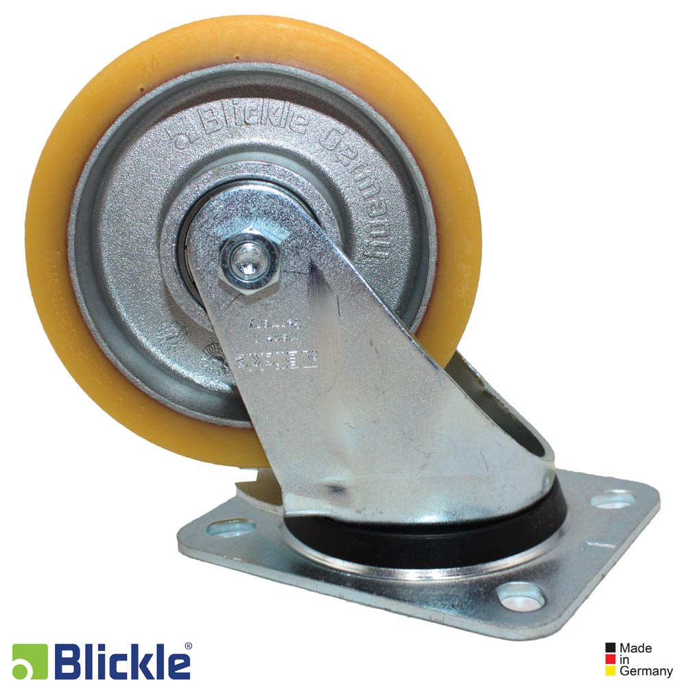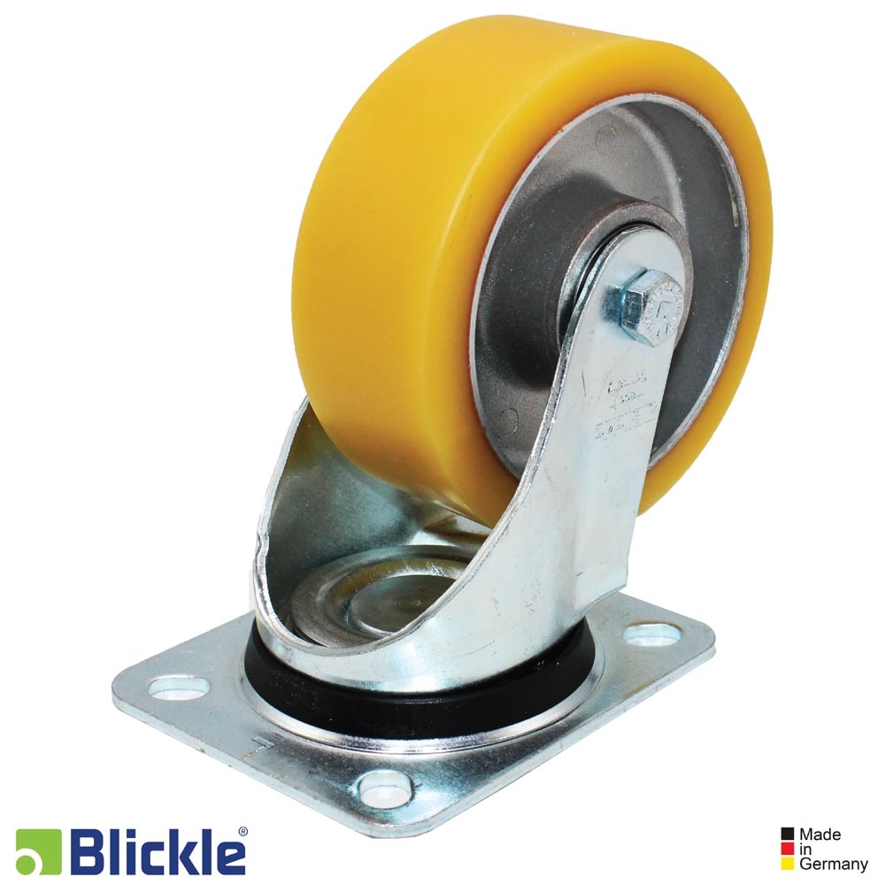 - banda de rodadura: elastómero de poliuretano de alta calidad Blickle Extrathane®, dureza 92 Shore A, color marrón claro, no deja huellas, no decolora al contacto