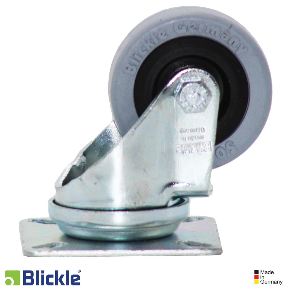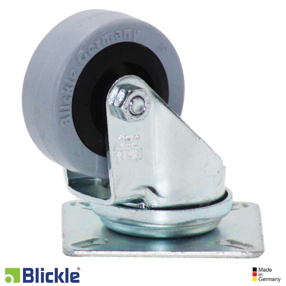 Soporte LPA: chapa de acero, zincada, pasivada color azu, libre de Cr6. Doble carril de bolas en la cabeza giratorioa. Vástago central estable. Juego mínimo de la vabeza giratoria, marcha suave, alta durabilidad gracias al remachado dinámico especial Blickle.
