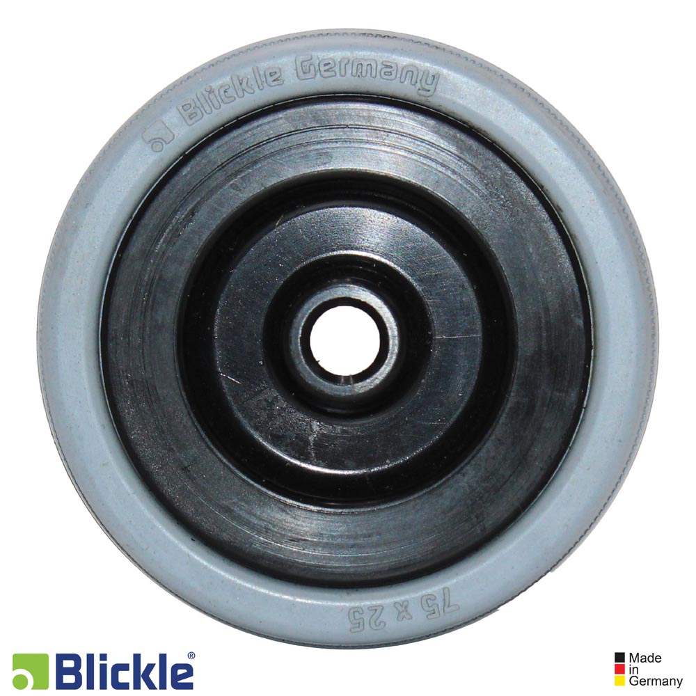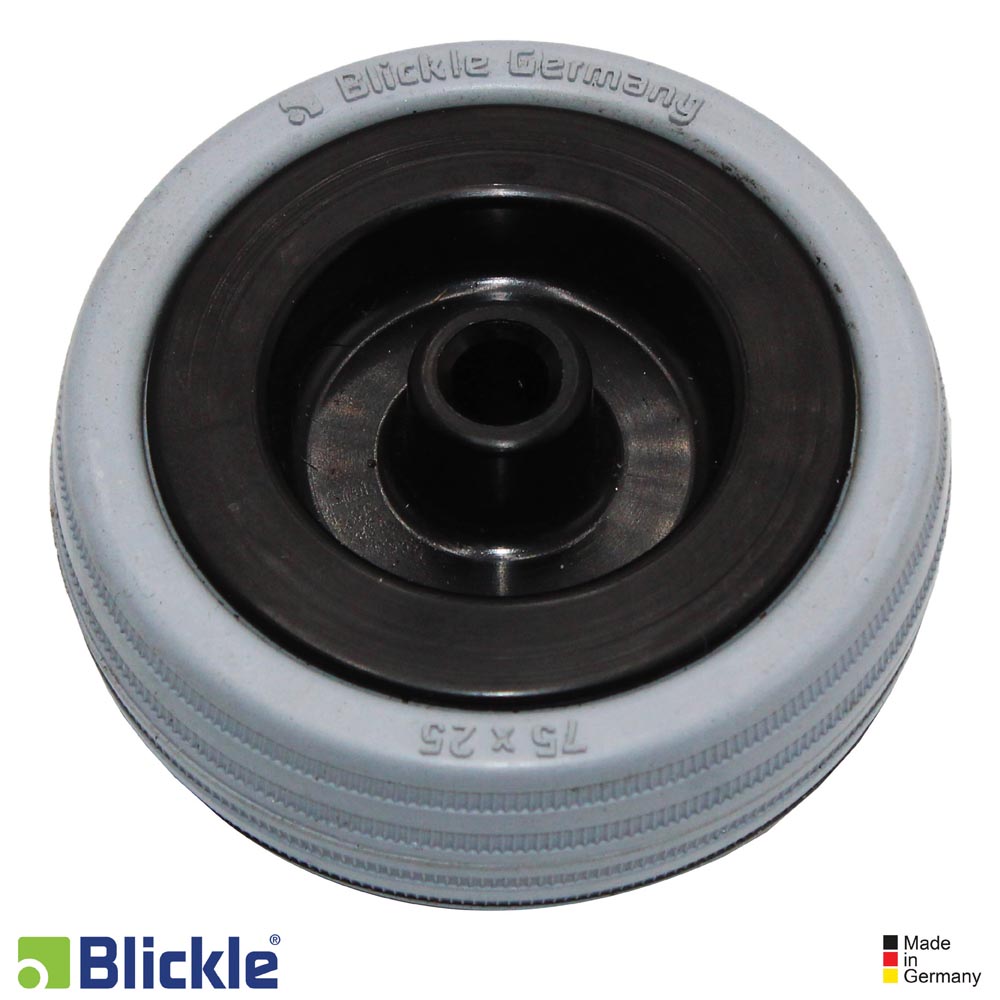 Banda de rodadura: de goma maciza de alta calidad, dureza 80 Shore A. Extraordinaria comodidad de marcha. Muy respetuoso con el suelo, marcha silenciosa. Color gris, no deja huellas, no decolora al contacto.