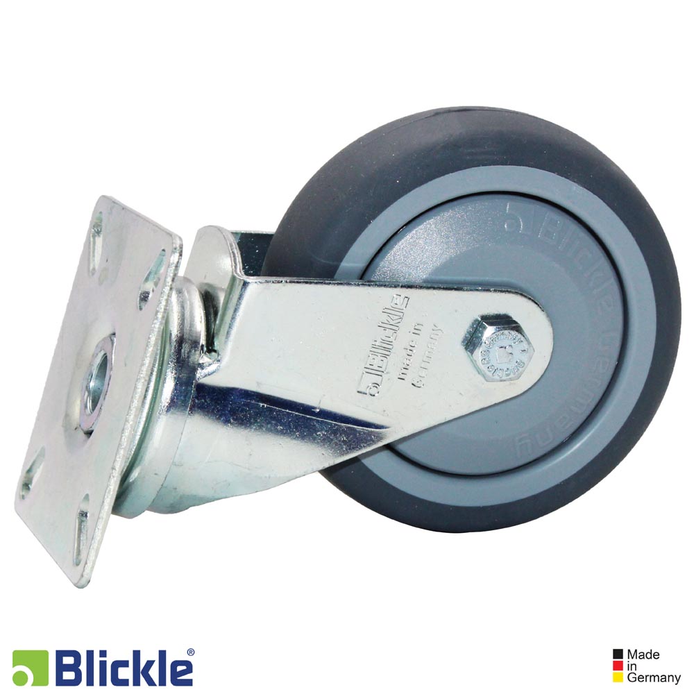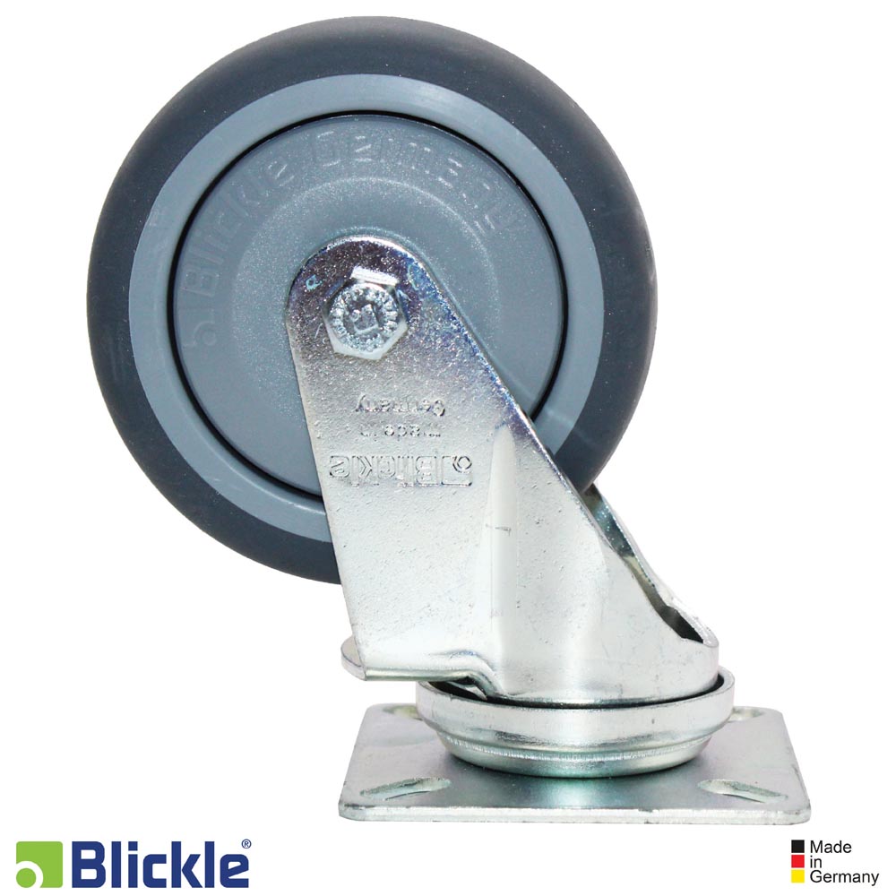 Soporte: chapa de acero, sincada pasivada color azul, libre de Cr6. Doble carril de bolsas en la cabeza giratoria. Vástago central estable. Juego mínimo de la cabeza giratoria, marcha suave, alta durabilidad gracias al remachado dinámico especial Blickle.