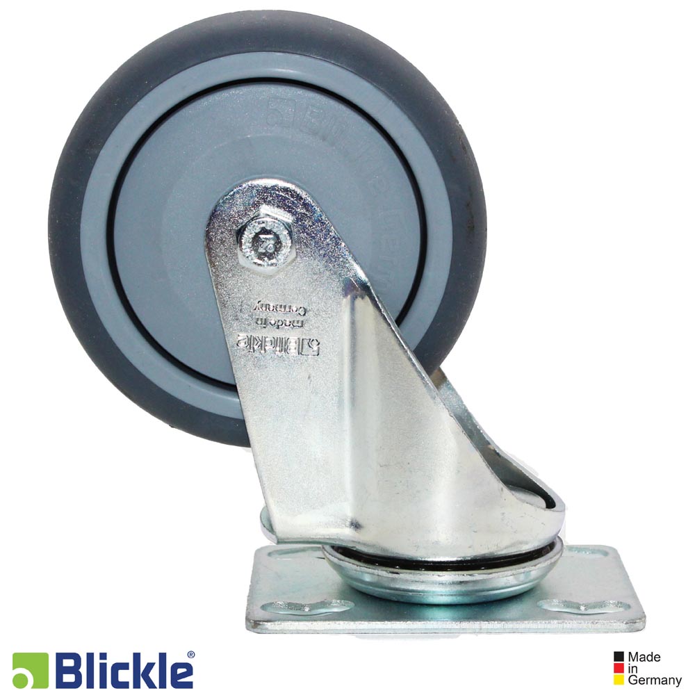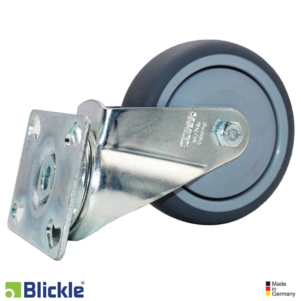 Soporte: chapa de acero, sincada pasivada color azul, libre de Cr6. Doble carril de bolsas en la cabeza giratoria. Vástago central estable. Juego mínimo de la cabeza giratoria, marcha suave, alta durabilidad gracias al remachado dinámico especial Blickle.