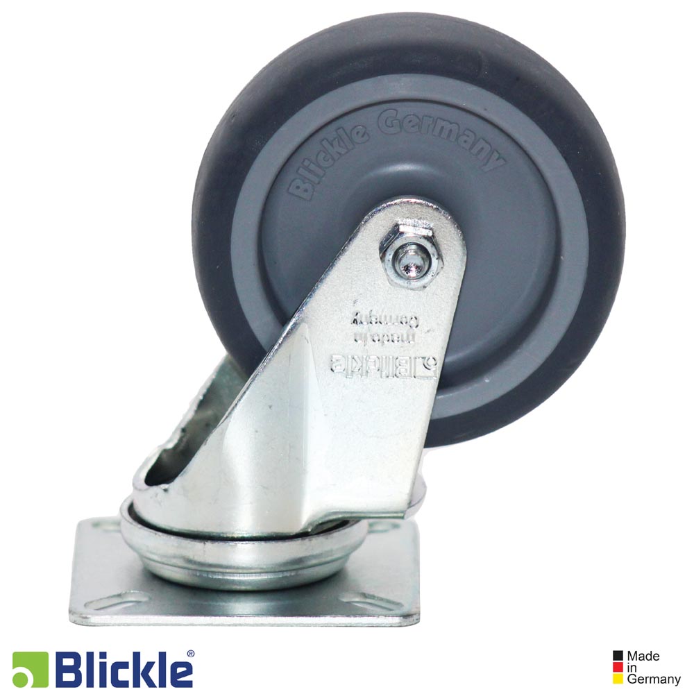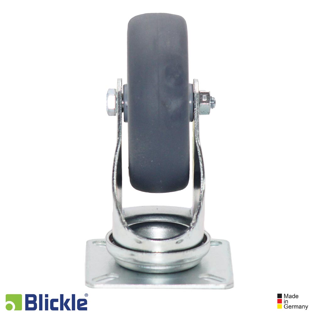Soporte: chapa de acero, sincada pasivada color azul, libre de Cr6. Doble carril de bolsas en la cabeza giratoria. Vástago central estable. Juego mínimo de la cabeza giratoria, marcha suave, alta durabilidad gracias al remachado dinámico especial Blickle.